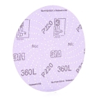 3M™ Hookit™ clean sanding disc 360L offers the latest innovation in dust evacuation. Multi-hole patterns evacuate dust better than 5 or 6-hole products significantly increasing cut rate and disc life. The new design does not need to align with the disc pad holes, making switching the discs fast, easy and convenient. Our 3M™ Hookit™ attachment system provides excellent backing support and further simplifies disc changes, optimizing disc life, while the film backing provides a consistent finish. The purple aluminum oxide disc comes in a variety of sizes and is available in a range of grades. Sandpaper discs cut better and last longer when dust isn't loading the cutting surface of the abrasives. Reducing dust is easier than ever with 3M™ clean sanding discs. An open coat means the abrasive grains have space between them so that sanding debris collects in the spaces rather than loading the cutting edge of the grains. The load-resistant coating allows the disc to continue cutting even when sanding softwoods, paints and other materials that would, otherwise, clog the disc and hinder sanding ability.
