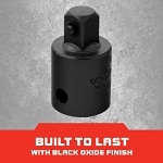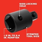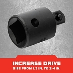 Conveniently increase your drive end size using the 1/2 in. to 3/4 in. Impact Drive Adapter. This adapter is constructed with heat-treated steel for strength and durability. It features a black oxide finish for corrosion resistance.