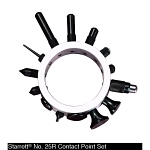 The Starrett Contact Point Set includes: 14 points with #4-48 screw thread to fit AGD indicators; a regular 1/4" (6.3mm) long point; 9 special form points; a 28 shock absorbing anvil; and 3 extra long points 1/2", 3/4" and 1" (13, 19, 25mm) long. The set features high grade steel, hardened and ground. All points are mounted on a convenient aluminum ring for safe keeping and easy selection. Contact Point SET.