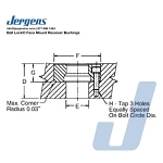 Jergens Ball Lock® Face Mount Receiver Bushings are generally utilized in blind hole applications (Slip Fit). Features, Benefits, & Product Specifications:Material: 4340 SteelFinish: Black OxideHeat Treat: 50-54 RCOperating Temperature Range: -20°F to 400°F (-30°C to 200°C)Note(s):Cap screws suppliedInstalled bushings should be approximately 0.012" (0.3mm) below subplate surface.