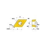 Mitsubishi Materials USA Corp, 459188, Turning Insert, Solid, DCGT Insert, Rhombic Shape, 9.525 mm Inscribed Circle, 3.97 mm Thickness, 11.63 mm Length, Positive Rake, SMG Chipbreaker, 0.4 mm Corner Radius, 0.173 in Diameter Hole, Manufacturer's Grade: VP15TF, ANSI Code: DCGT32.51MSMG VP15TF, ISO Code: DCGT11T304M-SMG VP15TF, 55 deg Included Angle, 7 deg Relief Angle, Neutral Cutting Direction, Carbide