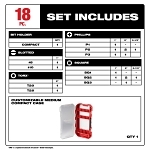 Milwaukee® SHOCKWAVE™ Impact Duty™ Driver Bit Set, 18-Piece, #1, #2, #3, 3/16 in, T15, T20 Point, Phillips®/Slotted/Square/Torx® Point, 1 in, 2 in, 3-1/2 in Overall Length, 1/4 in Drive/Shank, Steel