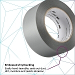 3M™ Vinyl Duct Tape 3903 is a hand-tearable general purpose tape with a rubber adhesive and embossed vinyl backing. This tape is ideal for a variety of purposes including temporary repairs, identification, contrast, decoration, securing wiring, bundling, sealing, holding, protecting and other jobs including applications requiring moisture resistance.