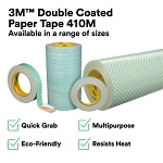 3M™ Double Coated Paper Tape 410M is a quick-grab double-coated tape with a strong rubber adhesive that offers a dependable hold for temporary attachments and project stabilization. Adhering to a variety of substrates, it can be used for splicing and core starting of papers, foils, films, and fabrics and it will tolerate elevated temperature environments — withstanding long-term use at a temperature up to 150 °F (66 °C) with short-term use up to 180 °F (82 °C). The adhesive is coated on a paper carrier designed to increase strength and help with removability for construction, fabrication, arts and crafts, and many more applications, including die-cutting and automated dispensing. Additionally, 3M™ Double Coated Paper Tape 410M is a reliable solution for mounting rubber or photopolymer printing plates to print cylinders and attaching golf club grips.