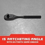 Proto® ProtoBlack™ Hand Ratchet, Non-Insulated Standard Length, Measurement System: Imperial, 3/8 in Drive, 7 in Overall Length, Pear Head Shape, 15 deg Minimum Arc Swing, 24 Geared Teeth, Knurled Slip Resistant Grip/Standard Handle, Specifications Met: ASME B107.10M, Federal GGG-W-641E, Yes Reversible, Steel, Black Oxide