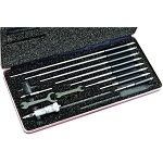 The Starrett 124 Solid -Rod Inside Micrometer Sets are the most popular inside micrometers because of their lightness, ease of use, and range. They are very useful for measuring inside diameters of cylinders and rings and measuring parallel surfaces. The desired range is obtained by assembling rods and spacing collars to the micrometer head. Measuring rods are provided with a shoulder that is set accurately in the micrometer head and locked in position. When assembling rods to the A and B heads, the reading line on the micrometer head should be lined up with the marking on each rod (except for the 50-75mm (2-3") rods). Rod diameters are approximately 6mm (1/4") on the A and B sizes, and approximately 8.5mm (11/32") on the C size. Each rod has individual length adjustment for the anvil by means of special wrenches furnished. 2-12" Range, .001" Grad, 10 Measuring Rods with Case.