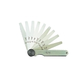 The Starrett English Thickness Gage is used in automotive, aviation, diesel and farm equipment manufacture and service and also in jig, fixture, gage and experimental work. These gages are Especially useful in adjusting tappets, spark plugs, distributor points, checking bearing clearances and gear play, fitting pistons, rings and pins and gaging narrow slots. Made in a wide range of types and sizes, each having from 6 up to 26 leaves ranging in thickness from .0015-.200" and 0.03-5mm thick straight or tapered. 9 Tapered Leaves, 1/2-1/4 x 3 1/32", inch reading, .0015-.015" Range.