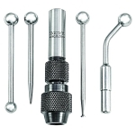 The Starrett Wiggler/Center Finder S828 and four different attachments adapt to countless applications and are readily interchangeable. The attachments are snapped in the chuck without removing the collet nut and are clamped by a ball swivel-joint which permits adjustment to an angular position or true concentricity. Center Finder complete with Nos. 828A/B/C/D, in Case concentricity.